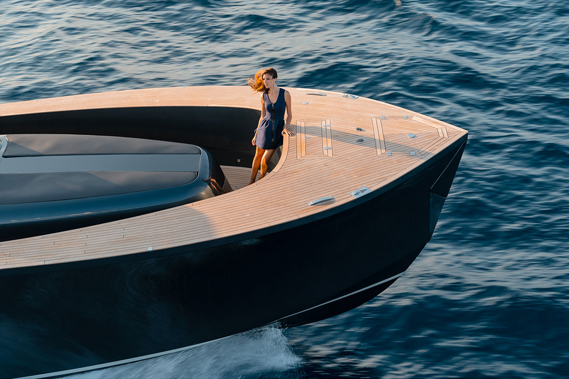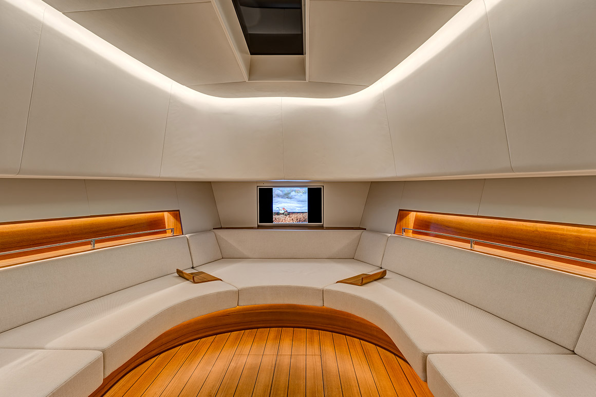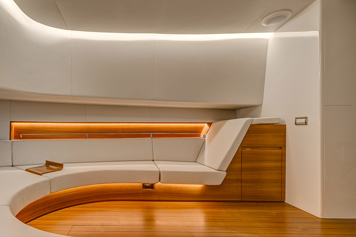 ‘Intelligent inspiration’ sums up the design of the yacht’s interior, which can be customised to the owner’s requirements. A crew cabin or extra bedroom can be included, the lounge sofa converts into a double berth and the cabins have generous storage space. Teak flooring, leather wall panels and lacquered surfaces produce a warm, natural ambiance.