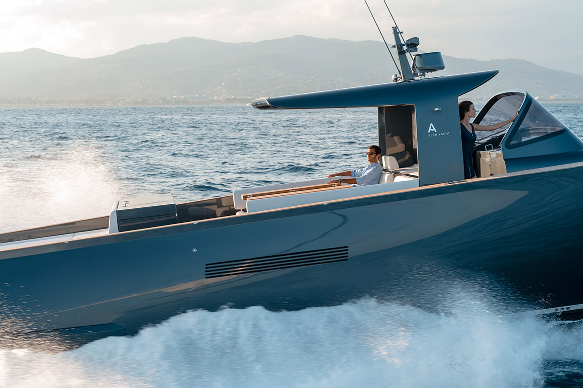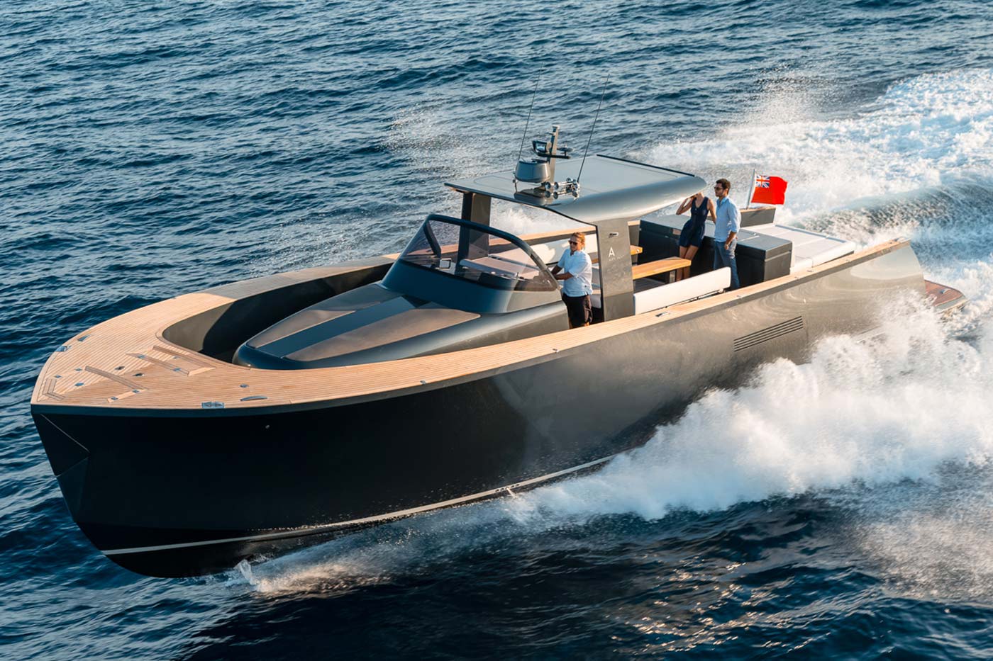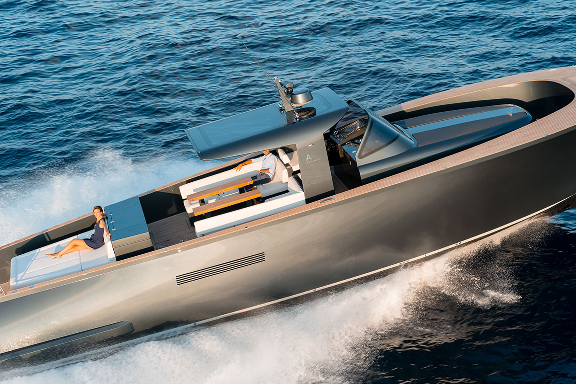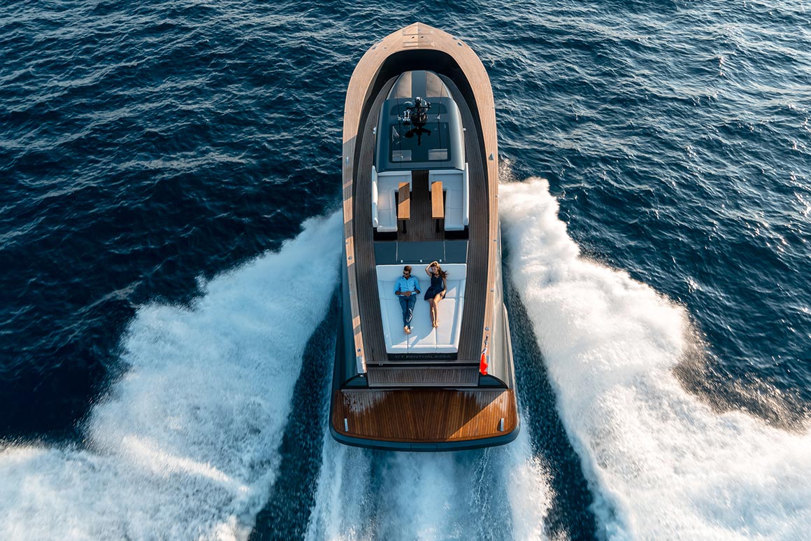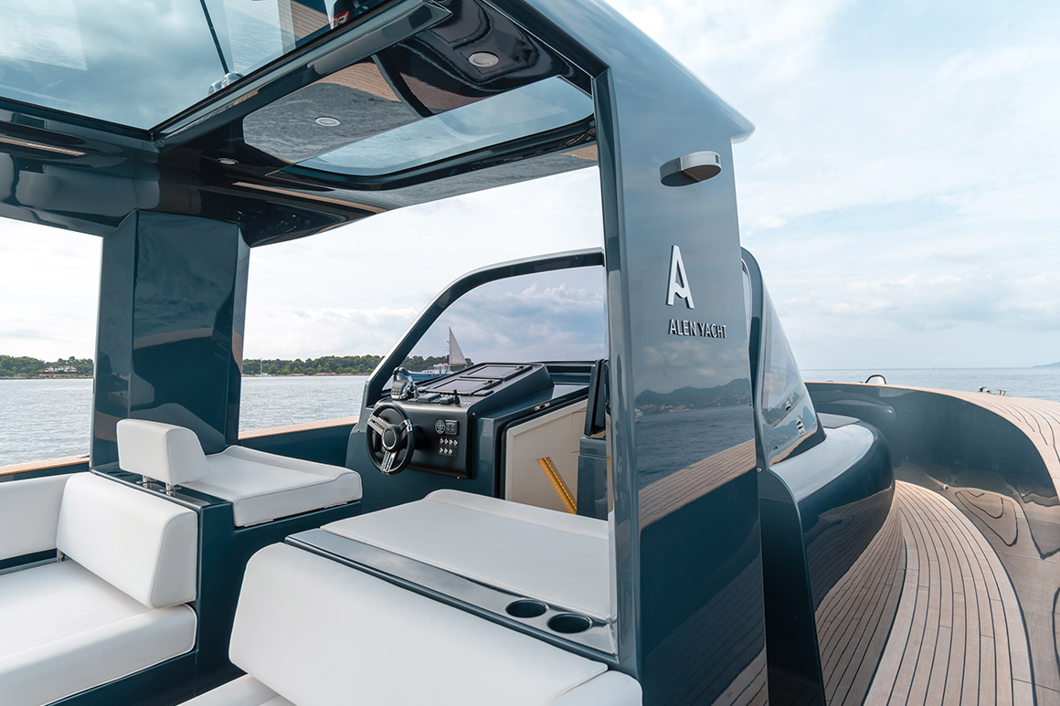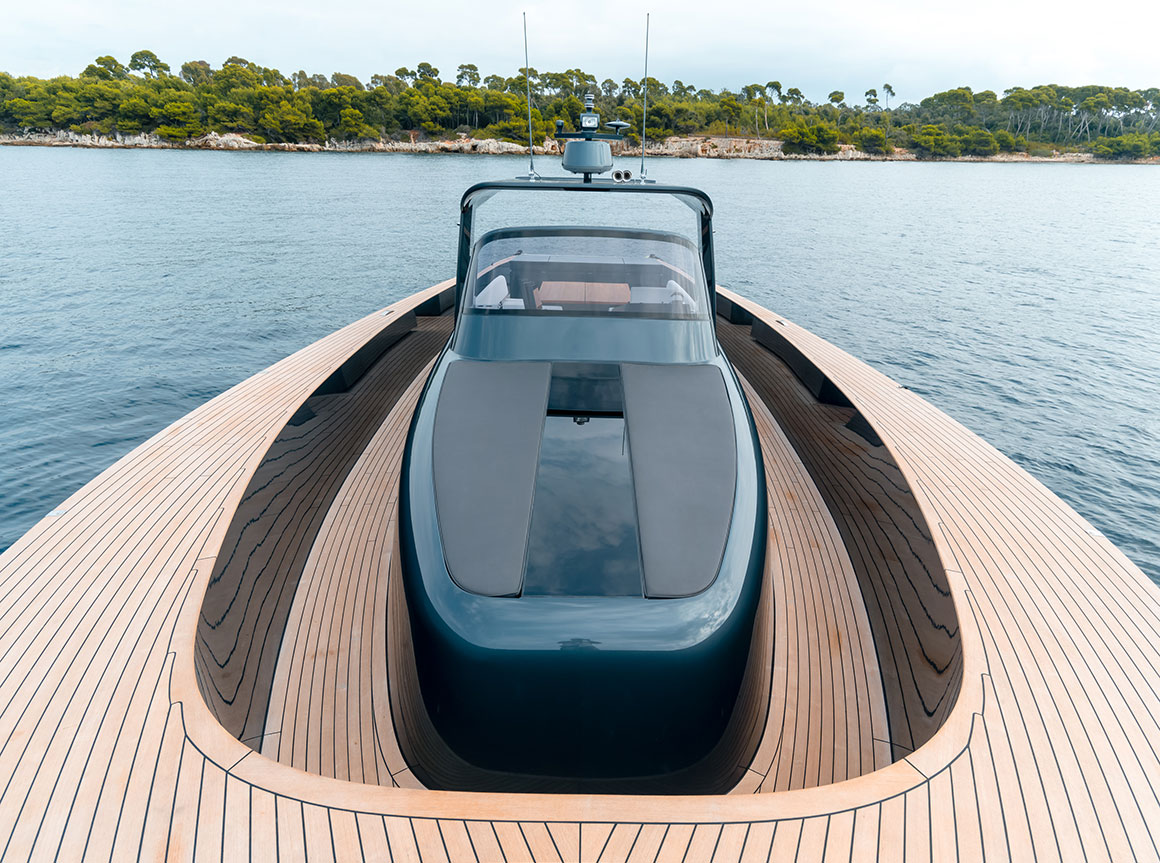 Up to 8 guests can comfortably sit at the extending table, near the open kitchen. At the shaded helm, the controls include the latest navigation equipment and a button to operate the hidden, custom-made anchor mechanism. Behind the aft sun-bed, the hydraulic gangway also doubles as a convenient swim ladder.